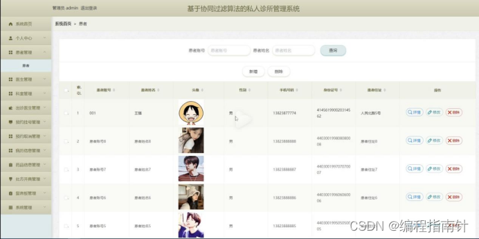 管理员患者管理。在患者页面输入患者账号和患者姓名进行查询,新增或删除患者列表,并根据需要对患者详情信息进行详情,修改或删除操作;如图5-8所示: