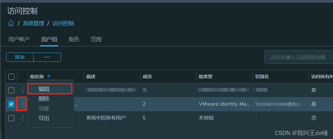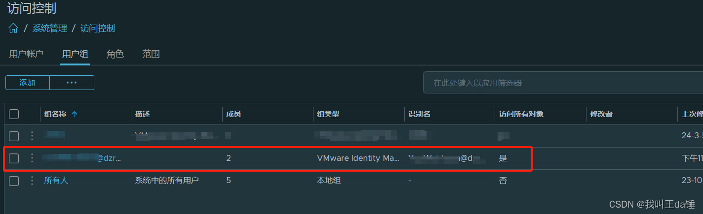 这样就完成了用户的注册。无需为该组中添加人员,因为人员信息可以通过vIDM去域里面自动抓取过来。如果你不是需要在管理员方面更加细粒度的划分权限,那么这样已经完成了关联,但是如果你需要区分,张三和李四的权限,那么就不能以组的方式添加,我们可以按照下面的方式进行添加具体成员,并且具体赋值。