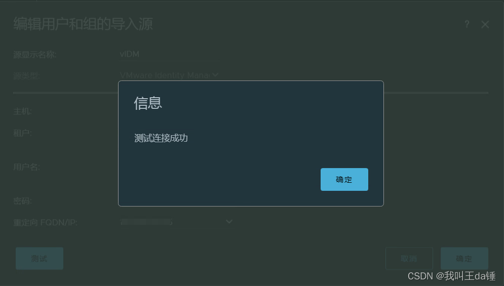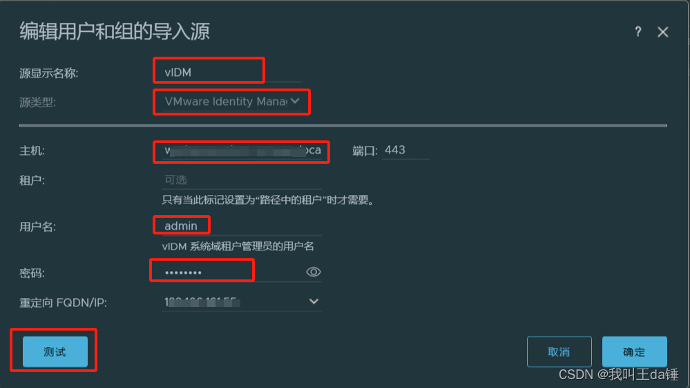 3、随意输入名称,类型选择VMware ldentity Manager,主机填写生成vIDM的URL,一定不是能是IP地址。用户名填写admin,密码填写vIDM初始化时候填写的。