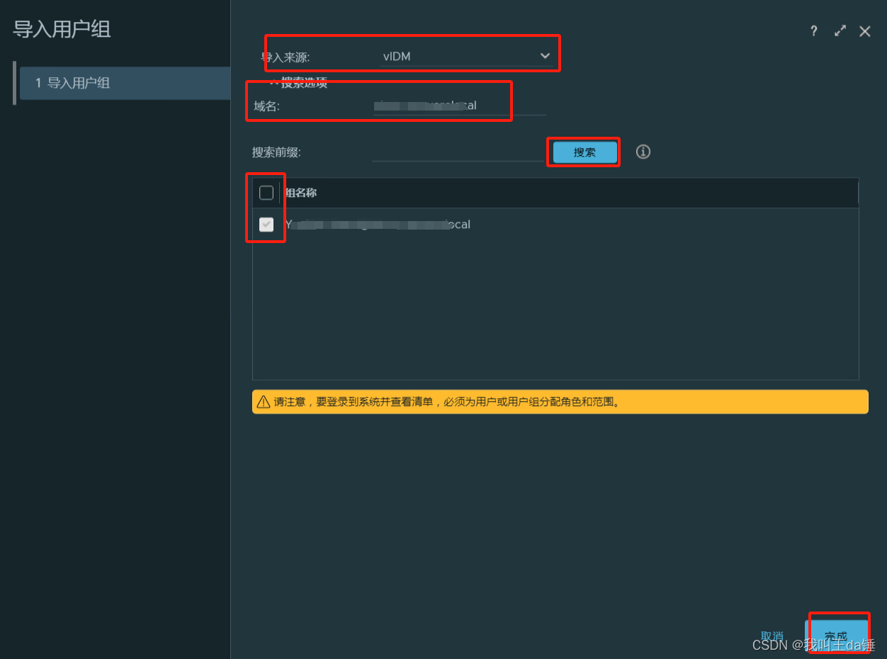 如果之前你建立过本地的用户组,我们也可以把vIDM的用户放入到本地组中,如果不放如任何组也是可以的,后面会多一步,因为个人没有对应权限,仍然无法访问系统。直接点完成。