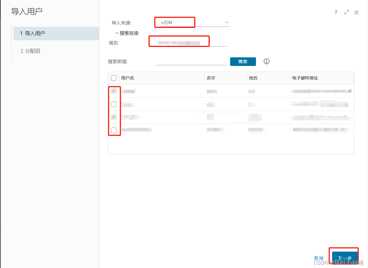 选择之前填写的关联信息的名字,填写域名,之后搜索出来的不再是组CN,而是具体的CN用户,勾选具体人员,下一步。