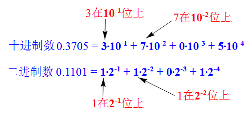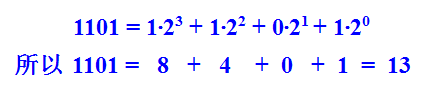 同理,二进制数1101的第一个1(最高位上的1)不是在千位(10^3)上,而是在2^3位上;第二个1,不是在百位上,是在“4”位上。