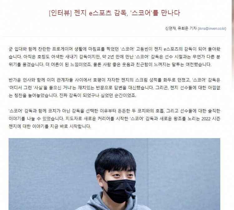 Score:虽然收到了很多教练offer,抛开亲份,GEN构想的蓝图非常好。如果不是监督一职的话,我会毫不犹豫地选择GEN。队伍的方向性特别好,如果说没有受到选手大名单的影响,那就是谎言。我认为优秀的选手们相互之间的化学反应也很好。在待遇方面……虽然是冬天,但内心也变得非常温暖呢。