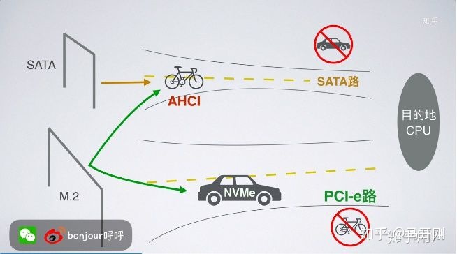 M.2接口(大门)既可以使用AHCI协议(自行车),走SATA通道(窄路),也可以使用NVMe协议(汽车)走PCIe通道(大路)。