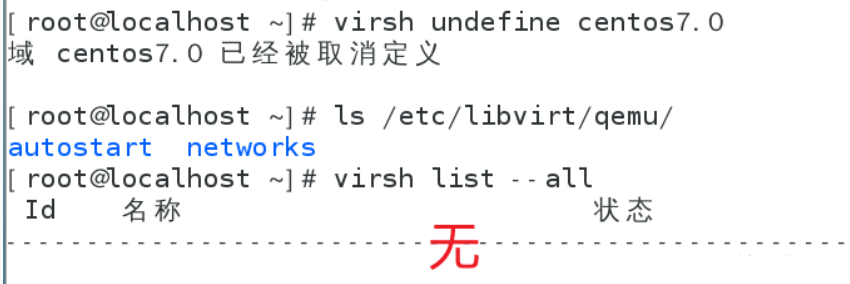 [root@localhost ~]# virsh undefine centos7.0域 centos7.0 已经被取消定义
