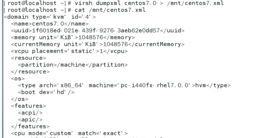 [root@localhost ~]# virsh dumpxml centos7.0 > /mnt/centos7.xml[root@localhost ~]# cat /mnt/centos7.xml