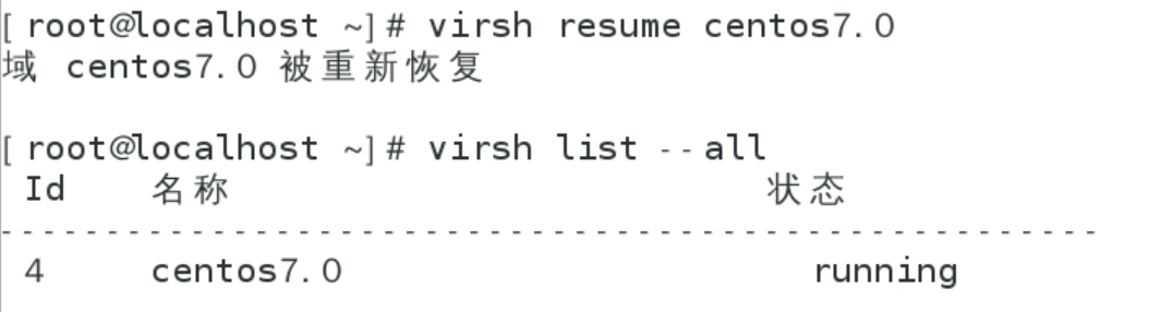 [root@localhost ~]# virsh resume centos7.0域 centos7.0 被重新恢复