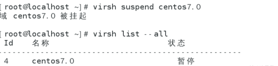 [root@localhost ~]# virsh suspend centos7.0域 centos7.0 被挂起