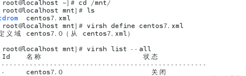[root@localhost mnt]# virsh list --all Id 名称 状态---------------------------------------------------- - centos7.0 关闭