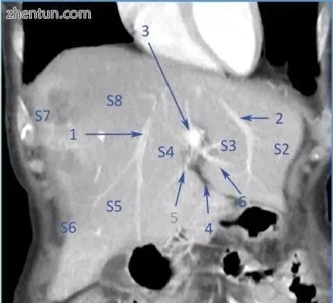 计算机断层扫描,冠状切面,显示肝静脉中间(1)和左(2)。3 - 左门静脉脐部(3),4 - 圆韧带,5 - P4,4段门静脉分支,6 - P3,3段门静脉分支.S2,S3,S4,S5,S6,S7, S8是肝脏部分(图片由布加勒斯特急救医院放射学和意象学系)。