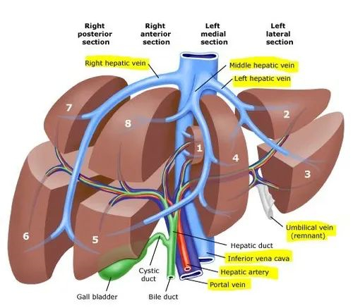 剖析尸体模型揭示脐裂(1),Arantius静脉韧带裂隙(2),S1(3),S2和S3的螺旋叶 - 肝段(图片由SH,IN提供)。