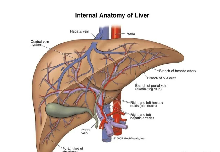 在肝门的右边缘,主门静脉分支成两个主要分支,即左右。门静脉分裂最常见的变异是右门静脉缺失,前门和后门分支直接与门静脉主干左门静脉一起出现。从它的起源,右门静脉有一个1-1.5厘米的肝外线。