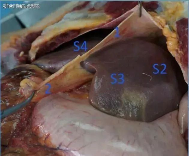 解剖尸体模型,揭示镰刀状(1)和圆(2)韧带:S2,S3,S4 - 肝脏部分(图片由SH,IN)。