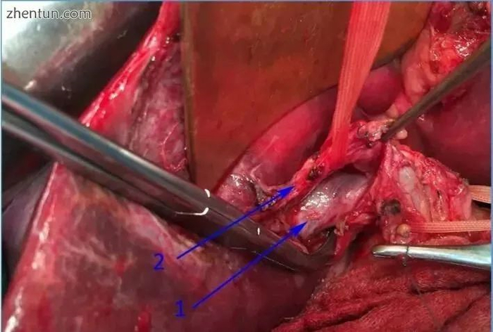 术中观察右门静脉(1)和右肝动脉(2)。应该注意的是,门静脉主干分叉到肝门的右端,因此左门静脉的出现非常接近解剖区域(图像来自IN的个人收集)。