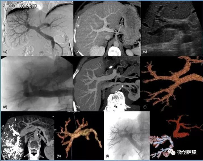 门静脉解剖结构的成像:(a)正常门静脉解剖结构的门静脉造影。(b)在正常门静脉解剖结构的门静脉期进行轴向增强计算机断层扫描(CT)扫描。(c)正常门静脉解剖结构的超声(US)。(d)1型门静脉解剖学的门静脉造影。(e)在1型门静脉解剖结构的门静脉期进行轴向增强CT扫描。(f)1型门静脉解剖结构的轴向3-D重建。(g)2型门静脉解剖结构的轴向增强CT扫描。(h)2型门静脉解剖的轴向3-D重建。(i)门静脉造影,3型门静脉解剖的轴向三维重建。(j)3型门静脉解剖学的轴向三维重建(图片由John Wiley和Sons从Charlotte Mouly,David Fuks,FrançoisBrowet,FrançoisMauvais,Arnaud Potier,Thierry Yzet,Qassemyar Quentin,Jean-Marc Regimbeau。右肝切除术中Glissonian法的可行性.HPP-国际肝癌胰胆管协会官方期刊.2013 15(8),638-645)(Mouly等,2013)。