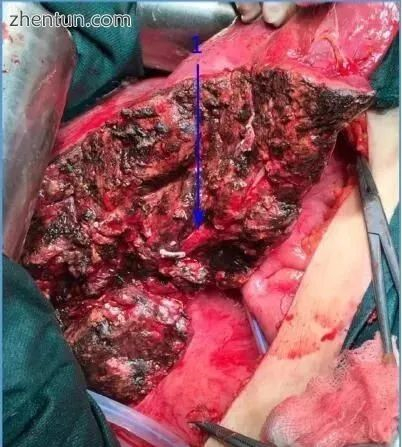 对直肠癌异时转移的节段6,7,8切除后残余肝切除表面的术中观察,显示段5(1)的glissonian蒂。