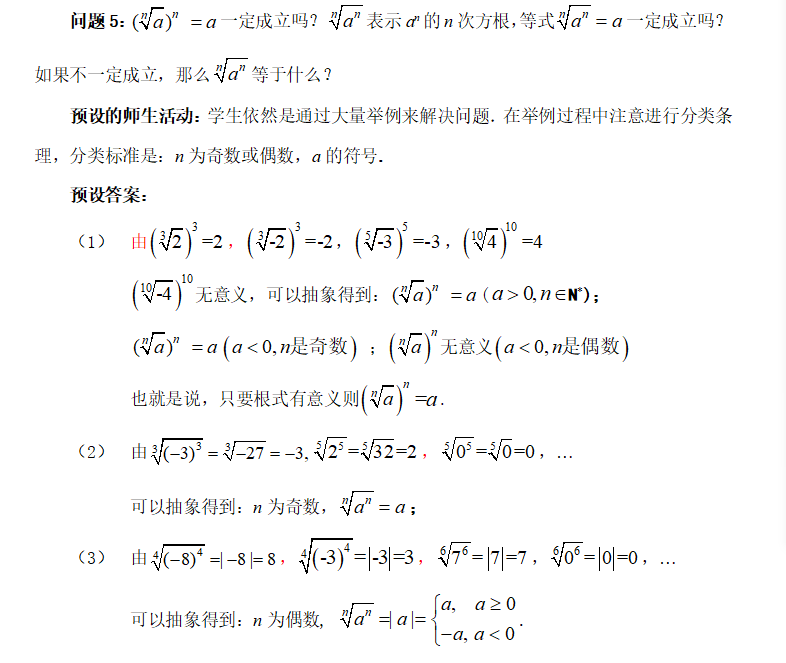 (2)学生通过将正整数指数幂转化为被开方数的指数能被根指数整除的根式,推广到被开方数的指数不能被根指数整除的根式,再进一步分析这一运算法则规定的合理性,通过根式与分数指数幂的互化,理解分数指数幂的意义.