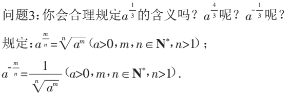设计意图:规范表示方法,通过探讨数学符号形成的科学性与合理性,与根式比较体会分数指数表示在运算中的简洁性,同时理解分数指数幂意义的本质就是根式.