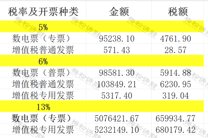 举个例子,梅松公司2023年2月开具的发票汇总如下,有税控系统开的增值税发票,也有电子发票服务平台开的数电票。