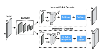 SuperPoint 是全卷积神经网络架构,它在全尺寸图像上运行,并在单次前向传递中产生带有固定长度描述符的特征点检测(见图 9)。该模型有一个共享的编码器来处理和减少输入图像的维数。在编码器之后,该架构分为两个解码器“头”,它们学习特定任务的权重——一个用于特征检测,另一个用于描述子计算。大多数网络参数在两个任务之间共享,这与传统系统不同,传统系统首先检测兴趣点,然后计算描述符,并且缺乏在两个任务之间共享计算和表示的能力。