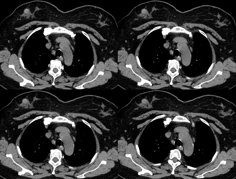 乳腺炎:包括急、慢性乳腺炎和乳腺脓肿,多见于产后哺乳期妇女,急性乳腺炎常有典型的临床症状-红、肿、热、痛;若治疗不及时可形成慢性乳腺炎或乳腺脓肿。MG 表现片状致密影,边缘模糊,患处皮肤水肿增厚,皮下脂肪层模糊;MRI-T1WI 表现为片状低信号,T2WI 高信号,信号强度不均匀,边缘模糊,皮肤水肿、增厚,增强 MRI 通常表现为轻至中度强化,且以延迟强化为主。