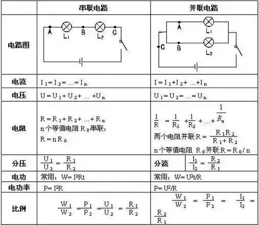 电路物理知识点总结(电路物理知识点总结大全)电学知识点大全 公式整理 1 电流 电压 电阻 电功 电功率在串联 并联电路的中的规律 电流 串联电路中电流处处相等 I I1 I2 并联电路中总电流等于各支路电流之和 I I1 I2 nbsp 并联电路分流 该支路电流的分配与各支路电阻成反比 即 I1R1 I2R2 电压 串联电路中总电压 电源电压 等于各部分电路两端电压之和 U U1 U2 串联电路分压 各用电器分得的电压与自身电阻成正比 即 并联电路中各支路电压和电源电压相等