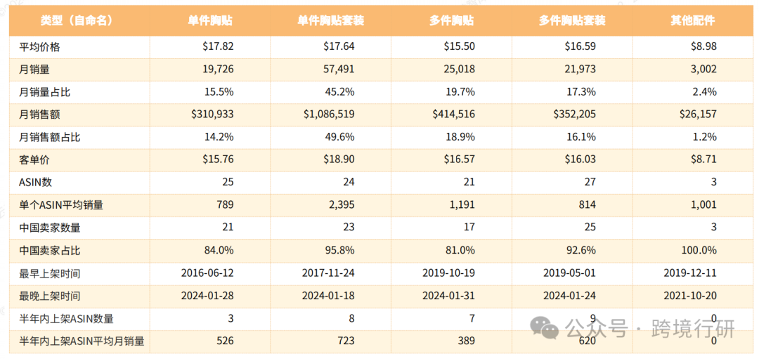 Adhesive Bras市场需求稳中有升,2023年胸贴年销售额接近6,800万美,年销量约332万个,销量同比上升35.2%,新品率高,适合年中布局,需结合自身实际决定是否适合进入。