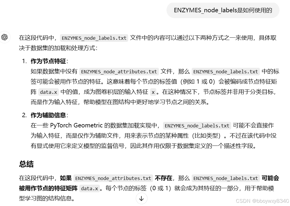 ENZYMES_graph_labels.txt:提供每个图的标签(类别)。这是最终分类任务的标签,也就是每个图所属的类别。在代码中,损失函数 会用到该标签进行监督学习。