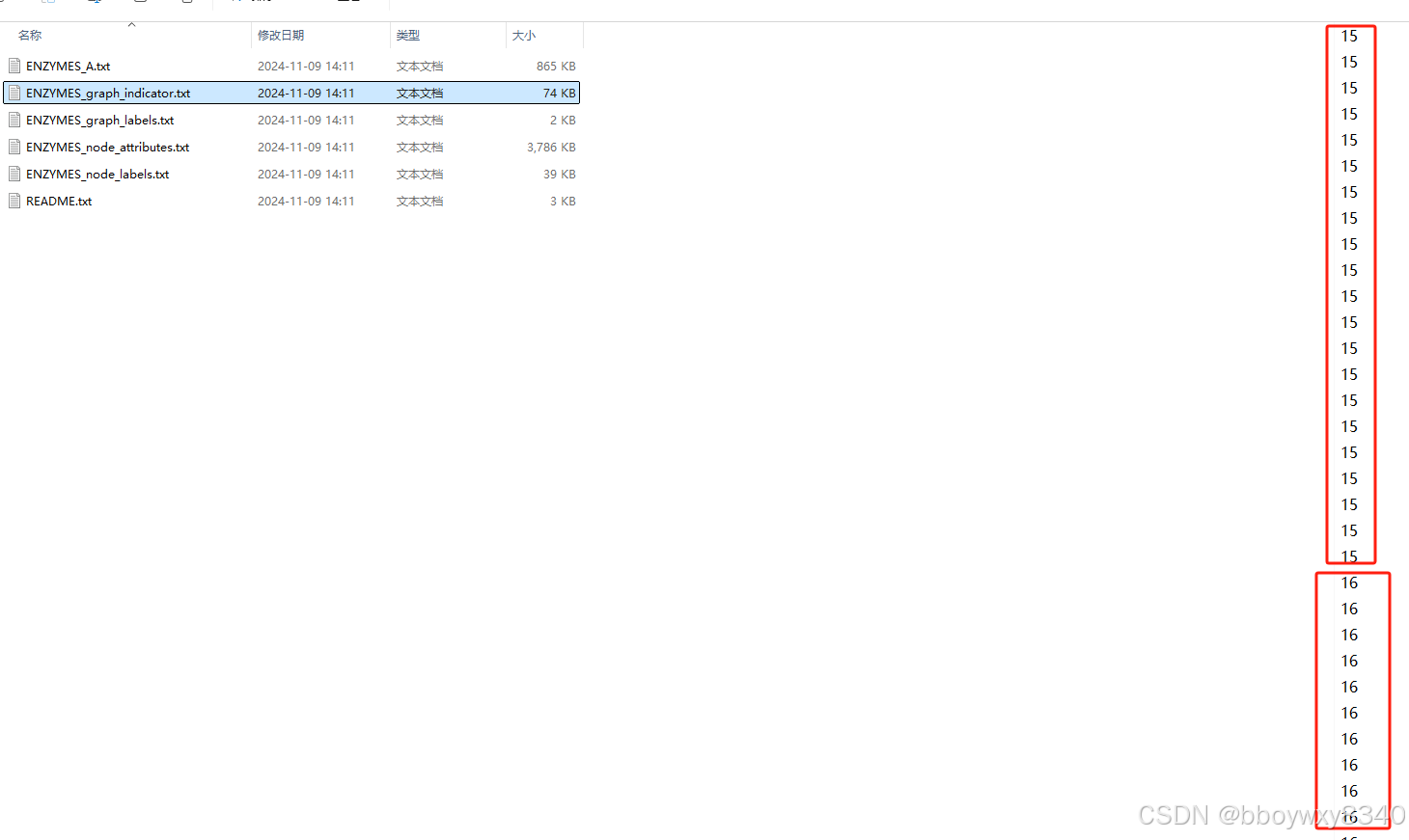 ENZYMES_graph_indicator.txt:用于指示每个节点所属的图。PyTorch Geometric 会自动将每个节点分配到对应的图中,以便在训练和测试时能够分辨哪些节点属于同一个图。