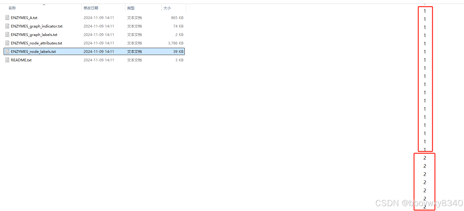 ENZYMES_node_labels.txt:用于给每个节点分配标签(标签只有 1 和 0),在一些任务中可能作为节点特征或属性被使用。