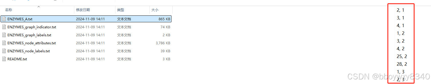 ENZYMES_A.txt:用于定义每个图的边(即节点之间的连接关系),这个文件中的数据会被转换成 参数,用于图卷积层 的输入。