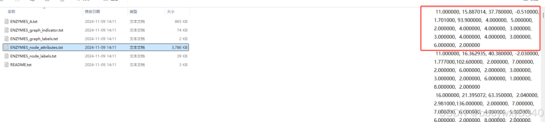 ENZYMES_node_attributes.txt:每个节点的属性或特征,作为输入特征矩阵 ,即 。如果存在这个文件,它会被用作节点的特征数据。