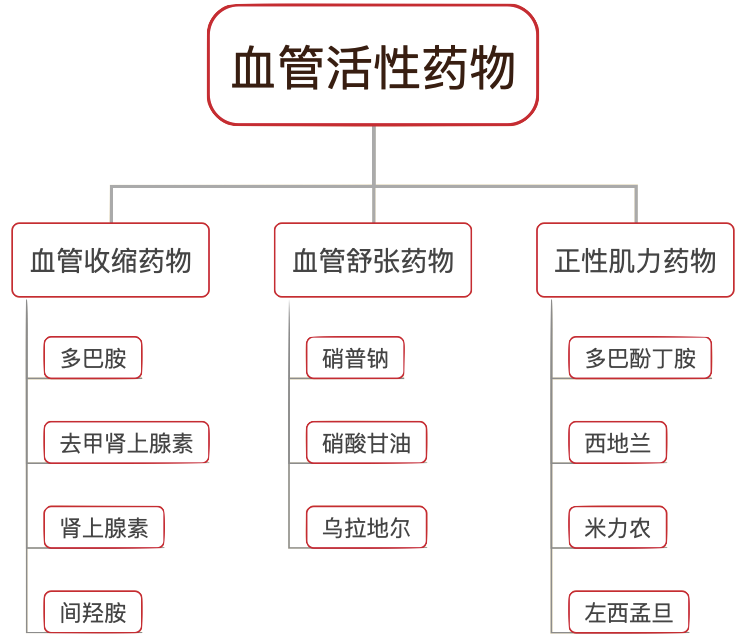 以药物主要临床作用为依据,将血管活性药物分为血管收缩药、血管扩张药和正性肌力药三类(如图 1)。最常用的血管活性药物,有剂量依赖性特点,不同剂量产生不同生物学效应,可简单记忆为利尿 —— 强心 —— 升压。• 低剂量:0.5~2 µg/ (kg·min) ,作用于多巴胺受体,使肾动脉扩张,肾血流量及肾小球滤过率增加,有一定的「利尿性」作用。• 中低剂量:2~5 µg/ (kg·min) ,既可以作用于多巴胺受体扩张血管,又可以直接激动 β1 受体产生轻至中度正性肌力作用。• 中高剂量:5~10 µg/ (kg·min) ,明显作用于 β1 受体使心肌收缩力加强,心搏出量增加;同时兴奋 α 受体使外周血管轻度收缩,但体循环阻力增加并不明显。• 高剂量:10~20 µg/ (kg·min) ,主要兴奋 α 受体使全身动、静脉收缩,产生升压作用。• 超高剂量:> 20 µg/ (kg·min) ,类似去甲肾上腺素(见去甲肾上腺素)。适用于心肌梗死、创伤、内毒素败血症、心脏手术、肾功能衰竭、充血性心力衰竭等引起的休克综合征,尤其有少尿及周围血管阻力正常或较低的休克患者,但需排除血容量不足。• 休克患者多巴胺初始剂量多采取 5~10 µg/ (kg·min),并随时根据血压及组织灌注指标调整剂量。• 临床上多巴胺常用中小剂量,可产生增加心肌收缩力、扩张内脏血管的作用。