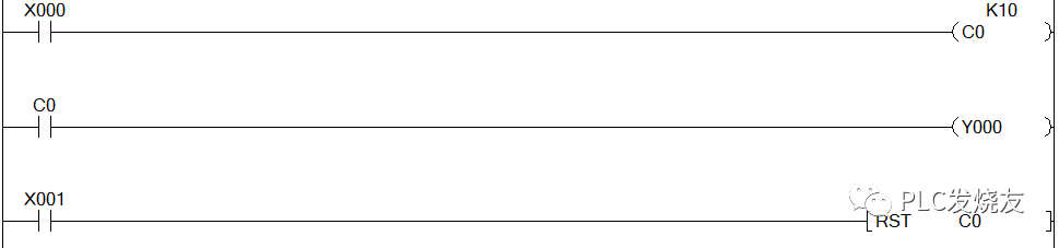 最基础的用法,如图2-0-4,X0的按钮按下10次后,C0的常开触点就会导通,触发Y0线圈进行输出;X1按钮按下C0的线圈断电并且计数值被清空,C0常开触点就断开,Y0线圈停止输出。