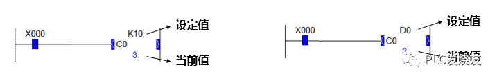 计数器器的设定值显示在定时器的右上角,可以用普通的数据,如下图2-0-5的K10,或者可以用寄存器去控制寄存器,比如填一个D0,D0里面的数据可以通过触摸屏去控制,也可以通过其他程序去控制。