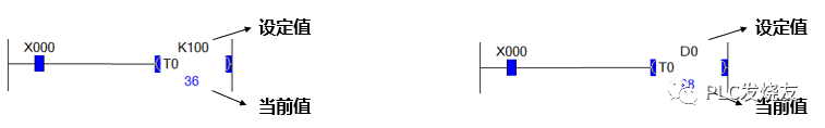 定时器的设定值显示在定时器的右上角,可以用普通的数据,比如下图的K100,或者可以用寄存器去控制寄存器,比如填一个D0,D0里面的数据可以通过触摸屏去控制,也可以通过其他程序去控制。