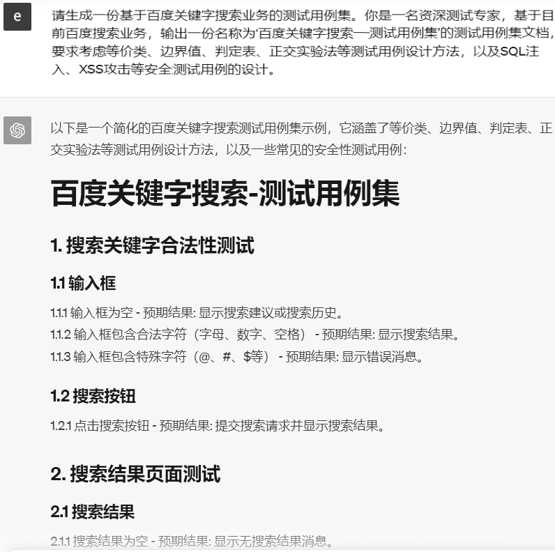 测试用例生成:从生成的百度关键字搜索业务测试用例集来看,它并不符合测试用例的规范格式。一个测试用例通常至少包括测试编号、前置条件、测试步骤、预期结果这 4 项内容,目前 ChatGPT 给出的格式明显不符合要求。