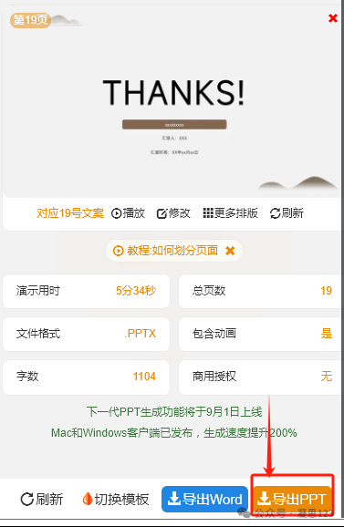 5、最后点击”导出PPT“就可以下载到本地了。每天可以免费生成一个PPT,(不够用,就多注册几个账号)
