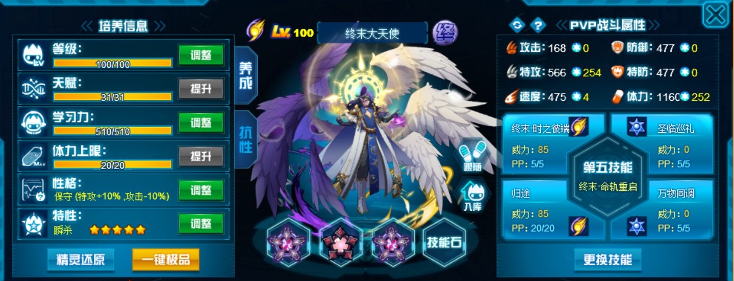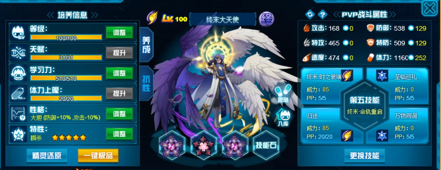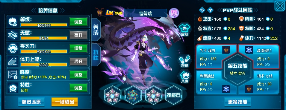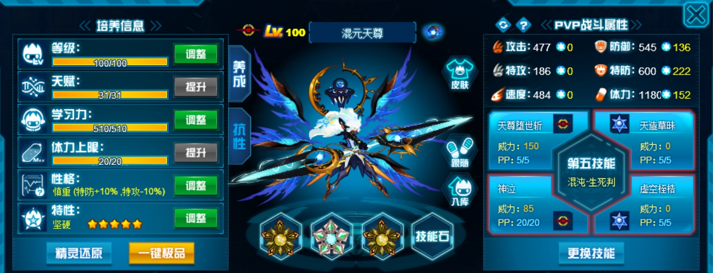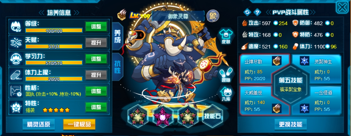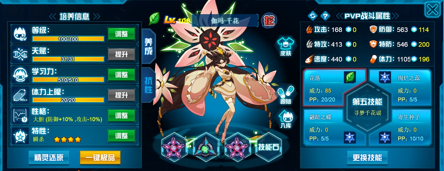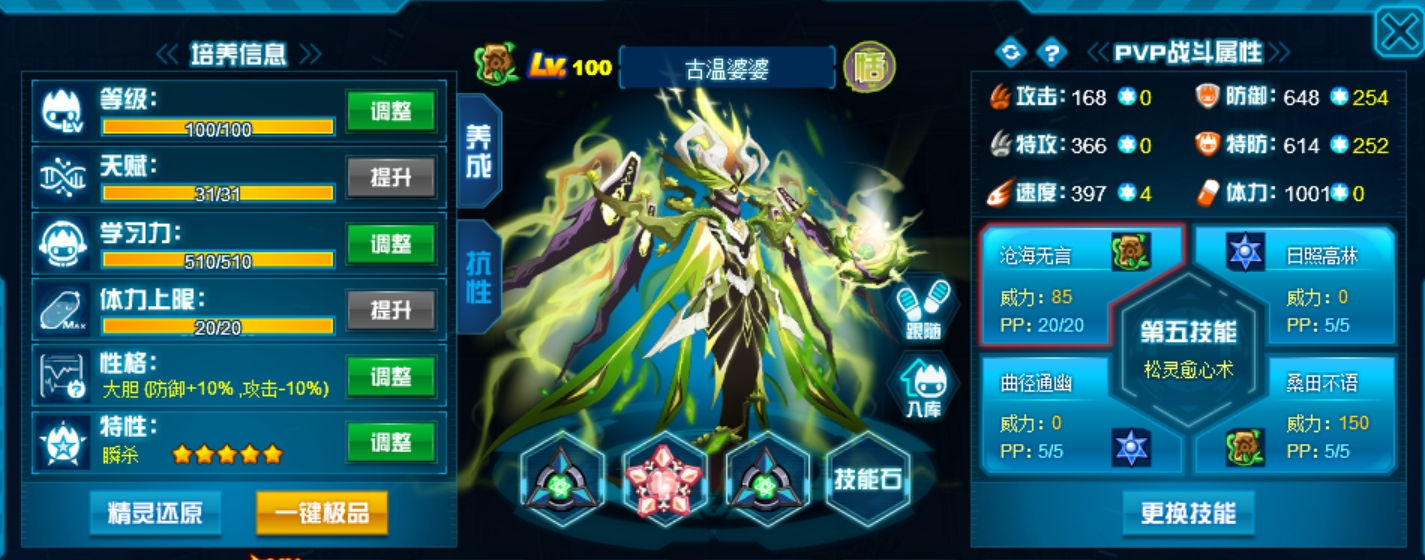 这个学习力其实是我PVE用的为了扛那些BOSS,懒得换了而已,反正盾体刷法PVP也不算差,刚好盾体刷法也可以搭配皇御中切有的时候可以做到皇御+魂印两段粉,对某些续航差的精灵来说也很疼。常规情况下直接选择攻体也是没有问题的。然后谱尼因为这个强大的消回合机制,其实并不是特别依赖极限高体,所以我就不放笑傲图了。
