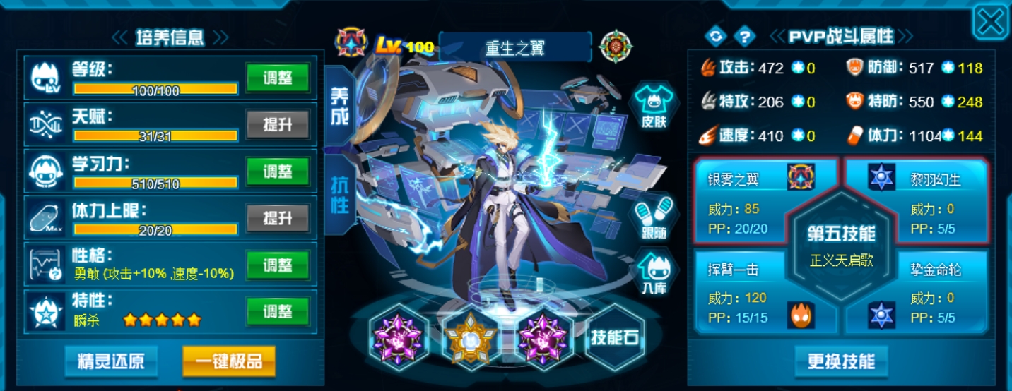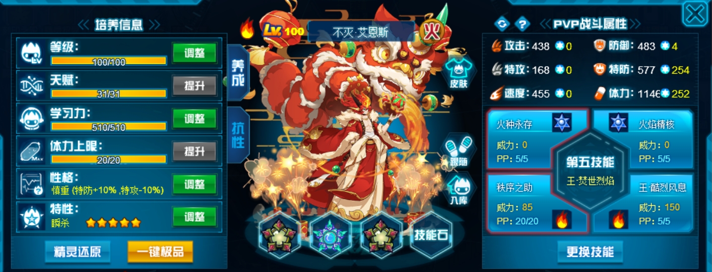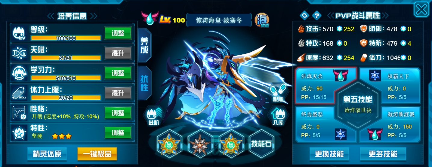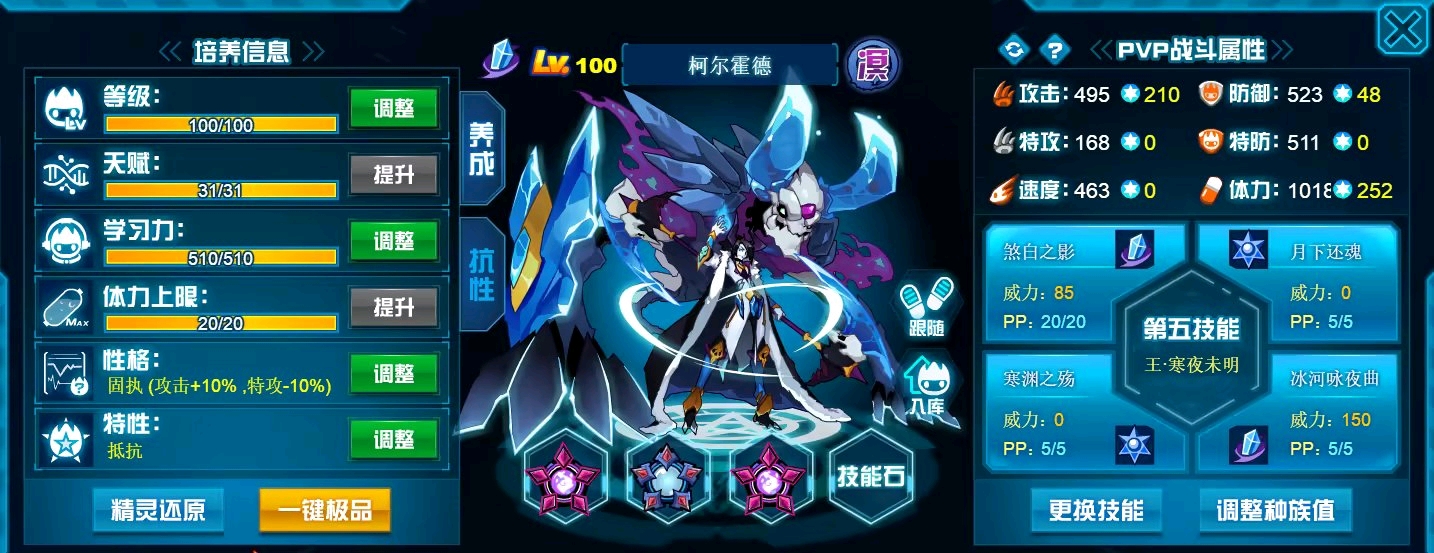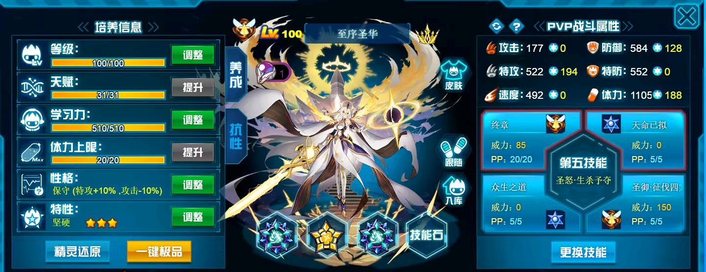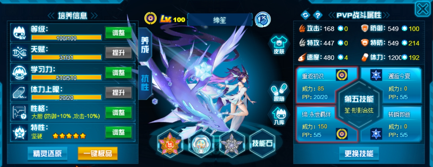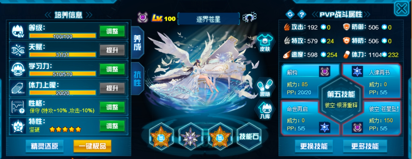 这个学习力其实是我PVE用的为了扛那些BOSS,懒得换了而已,反正盾体刷法PVP也不算差,刚好盾体刷法也可以搭配皇御中切有的时候可以做到皇御+魂印两段粉,对某些续航差的精灵来说也很疼。常规情况下直接选择攻体也是没有问题的。然后谱尼因为这个强大的消回合机制,其实并不是特别依赖极限高体,所以我就不放笑傲图了。