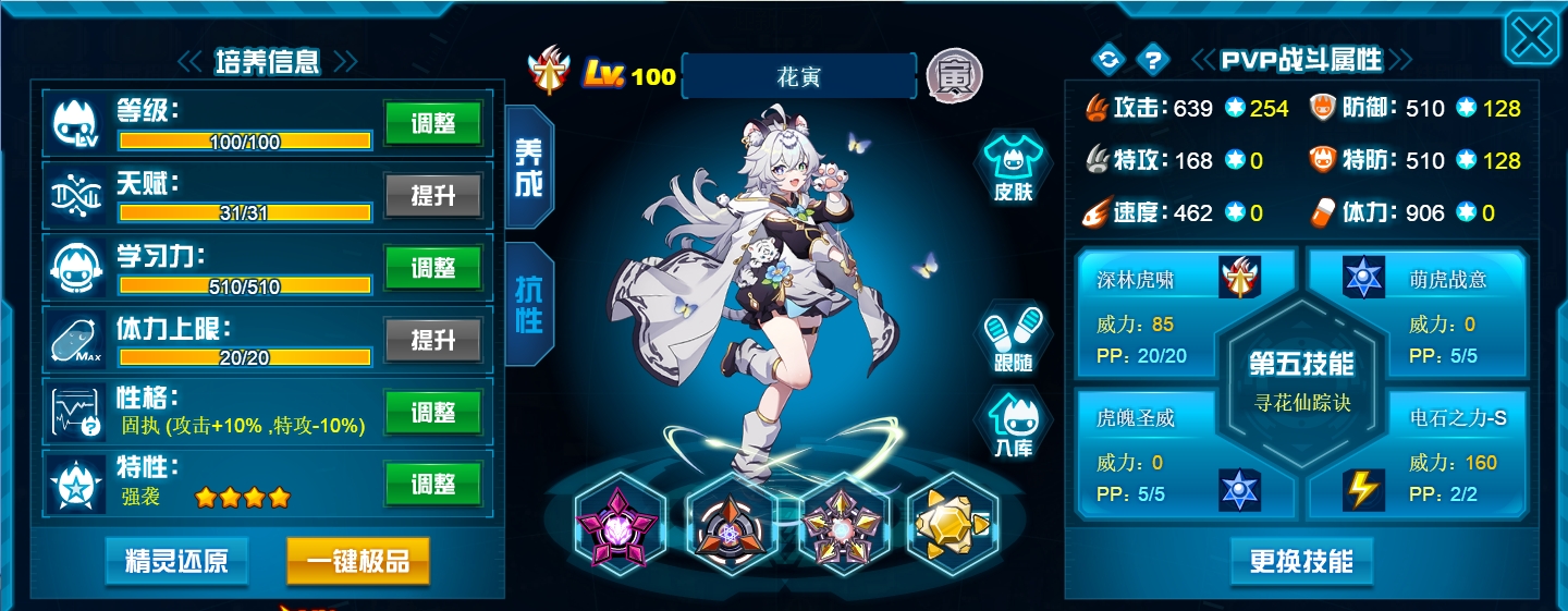 技能方面,花寅的最后一个格子非常空闲,完全可以选择带电石来打东叔和天尊。需要压体所以就选择攻盾,500+防加上皇御受击续航也很肉了,足够保障中切的生存。