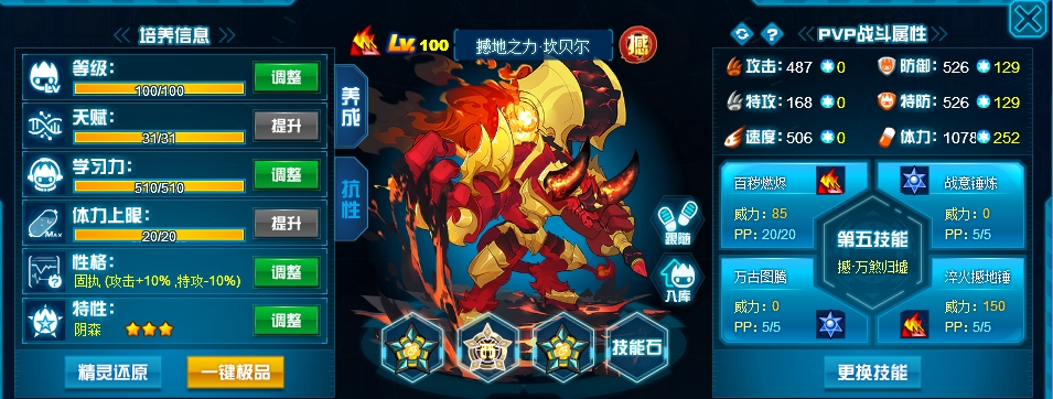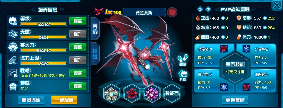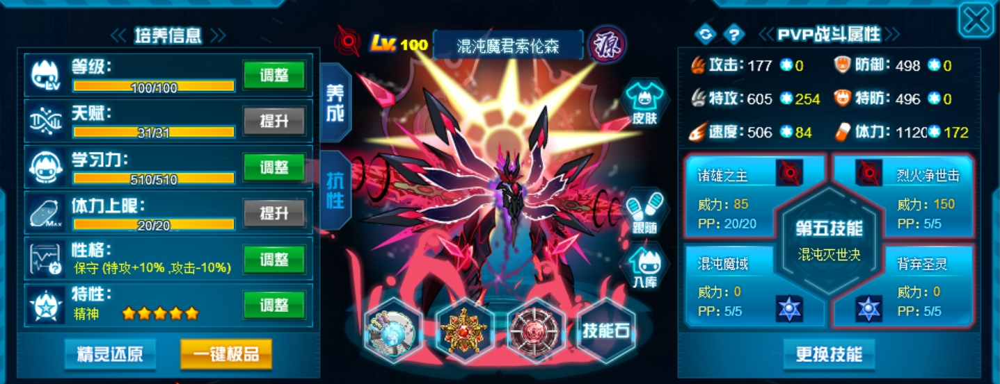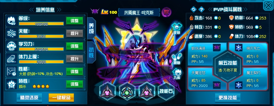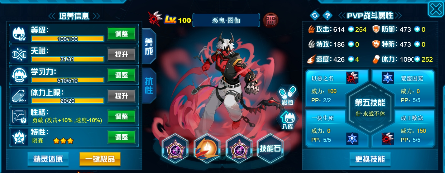 刷法上就常规的攻体没什么讲究,不过双防我觉得没必要因为弹伤技能刻意去压,因为恶鬼除了弹伤之外也经常中切消耗次免搭配艾夏拉联防,所以还是有必要堆一点直接的肉度,再说了,像坦普瑞这种基本刷攻还非常高倍克制的对象该弹死也直接弹死不需要刻意压。 然后恶鬼比较适合后手第五消回合封属和吸血,所以性格给了勇敢,不用担心因为速度不够主动性差的问题,以恶之名和成王败寇都是可以有额外先制的。