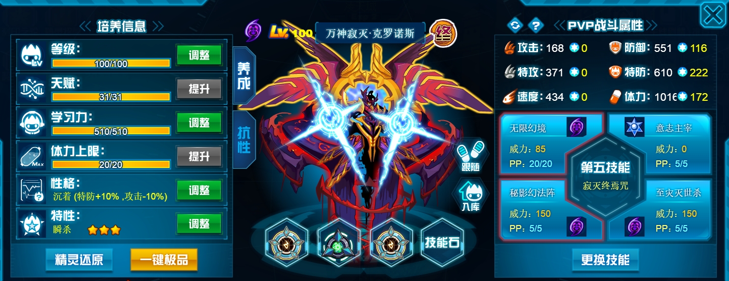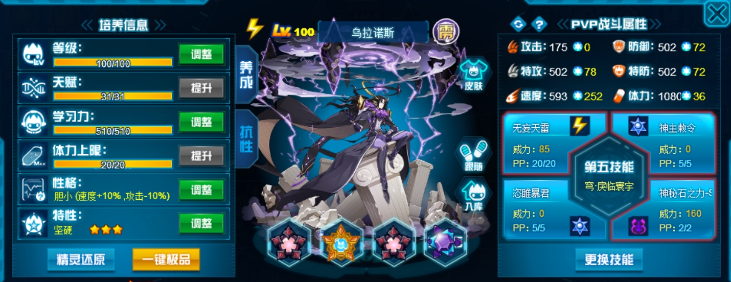 也是被我前阵子改成盾体了,这批只能说传统的堆速度数值太不吃香了,再加上现在皇御加持常态下墨影青龙千花卡托娜等一大批插件也能让元神难受,所以选择了“活着才有输出”。当然速度刻印可以不用换掉,毕竟双防都是直接≥30,改个学习力就行,保持一点速度打内战也不错。另外,比起皇御来说其实盾体元神更适合腐蚀,靠那个腐蚀被动拉回合差打。