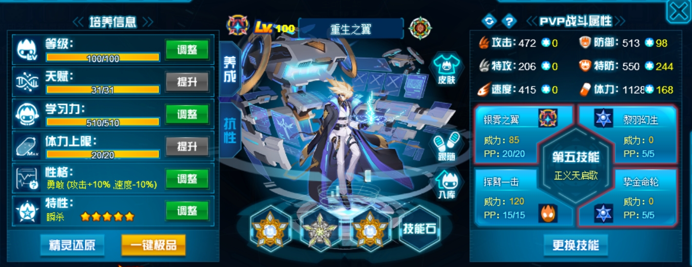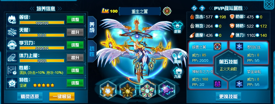现在重生最大的作用是联防和辅助,活着的时候联防能力是最核心,如果我方有阵亡精灵那此时就能体现出复活的优势,能打就打能防就防,顶不住了就能复活队友保证我方精灵数,所以纯盾体和攻体特防三刷是最优的选择。由于最近官方把各种能力值比例粉伤词条全部改成了百分比伤害,也是导致重生的吃混伤能力有所下滑,所以可以适当降低防需求,但500物防550特防1080体这种基本肉度还是必须得有,体力可以更高一些。