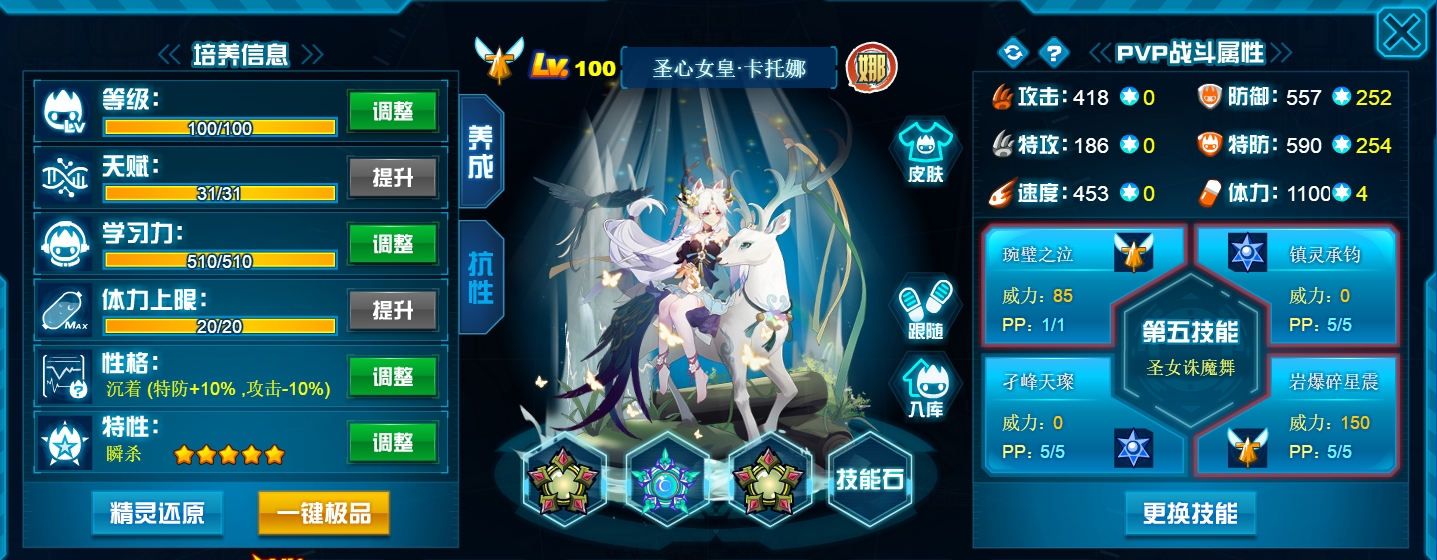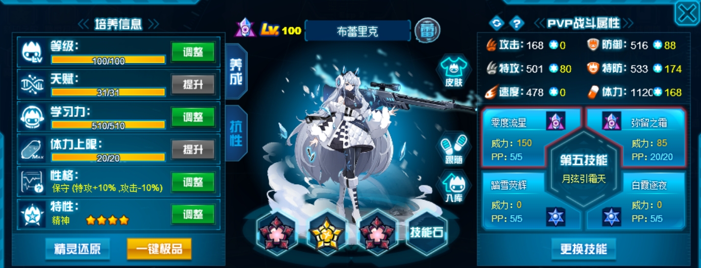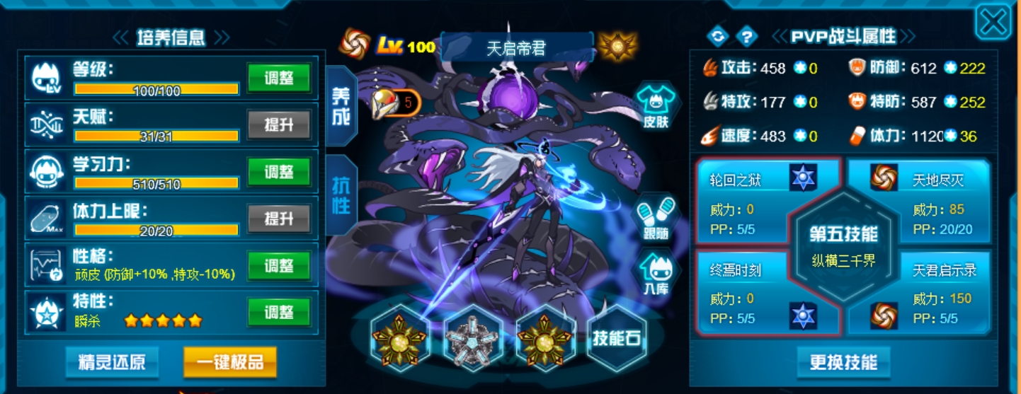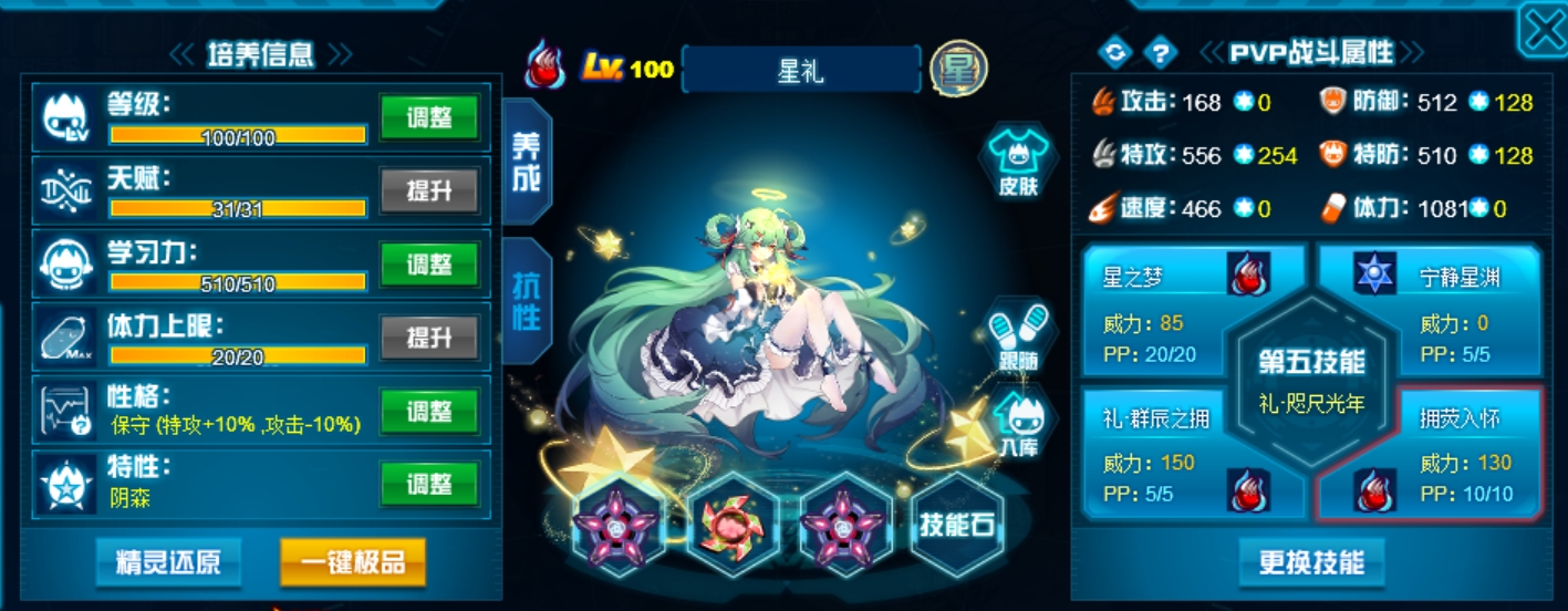 两个攻击技能全部带老的,稳定,新的不必中并且命中率堪忧。抗性选55疲惫全方位针对星皇。