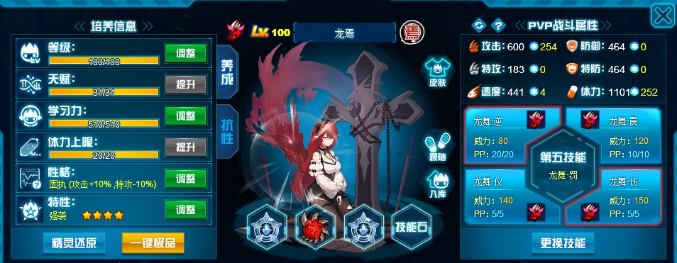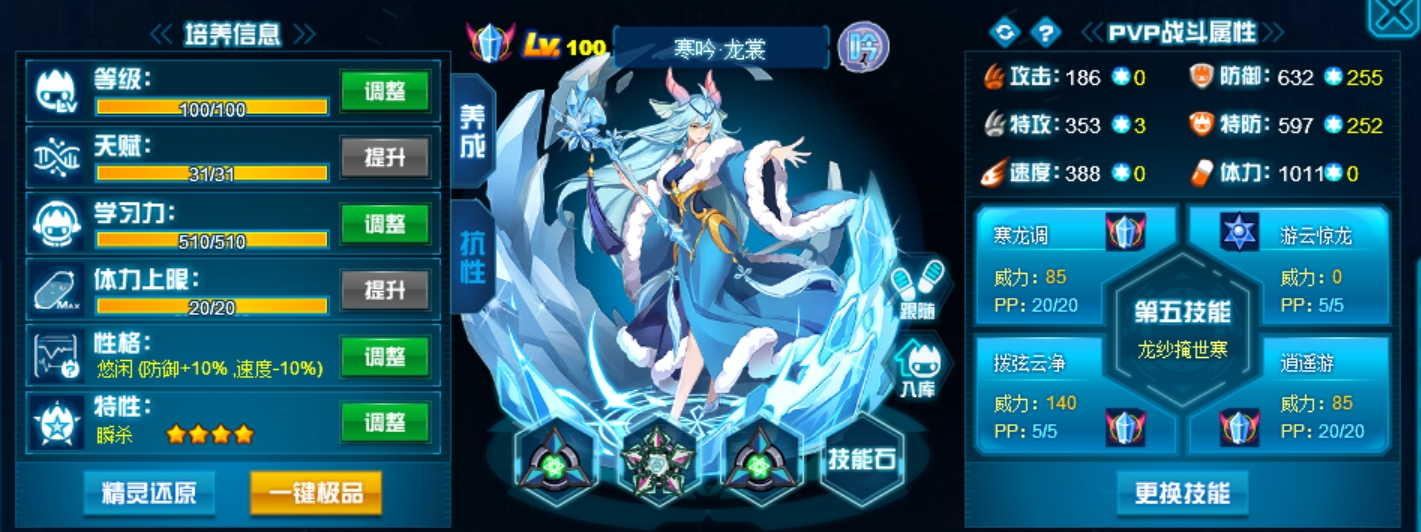 技能我是选择舍弃了强化带必中反弱防一些弱化流,主要龙裳的输出基本来源于粉伤外加保底300伤害所以属性技能有游云惊龙够了,也可以选择带随霄伴月舞来控制。