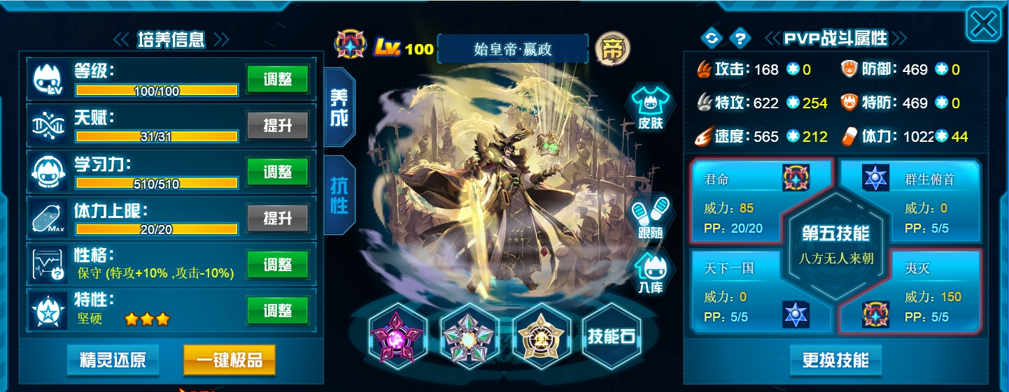 不过个人觉得这个精灵缺陷还是相对较大,抓不到合适的跳板的时候基本主打一换一,但一换一情况下嬴政太容易送回合差。另外,特性我其实觉得精神更好,但洗不出,这个坚硬也就先凑合用了。