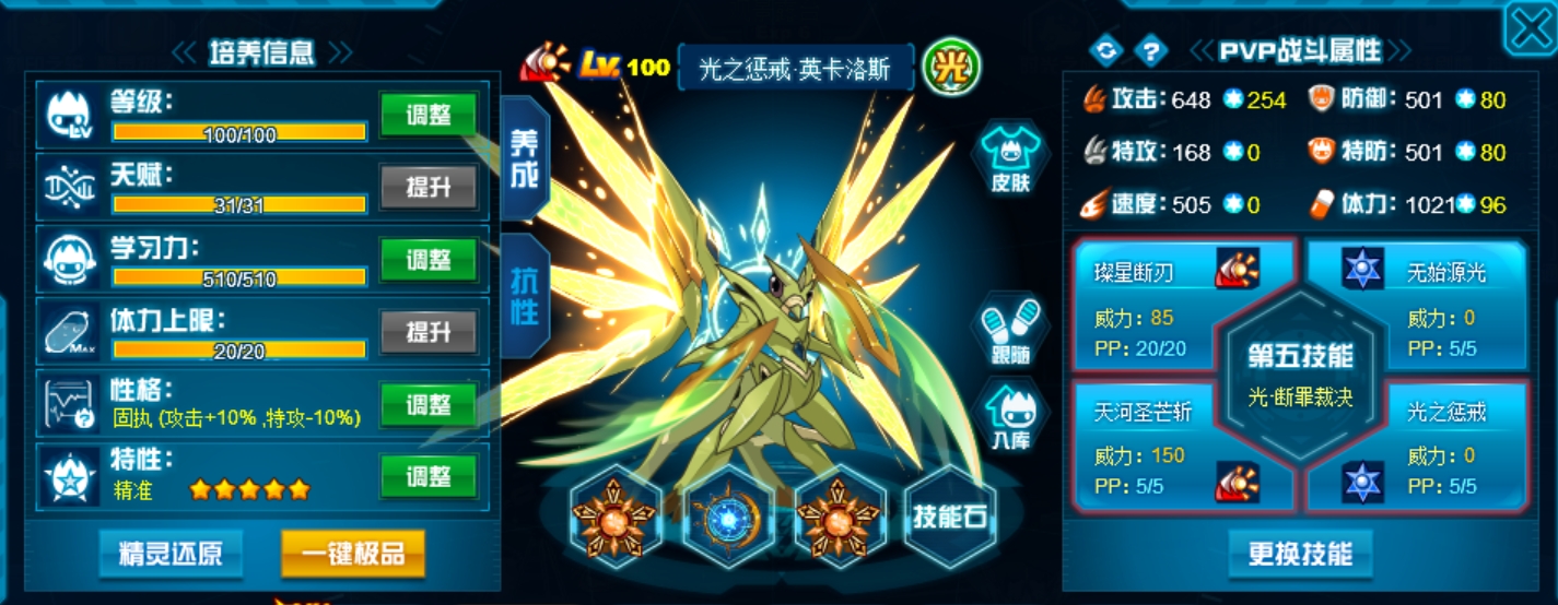 特性我个人还是推荐精准最好,输出稳定,因为螳螂的常规技能命中率低。依旧是不建议把光之惩戒换成满月破碎,满月破碎不仅异常太随机很鸡肋并且命中率为螳螂所有技能里最低,打犀牛可以光之惩戒和璨星断刃对点。