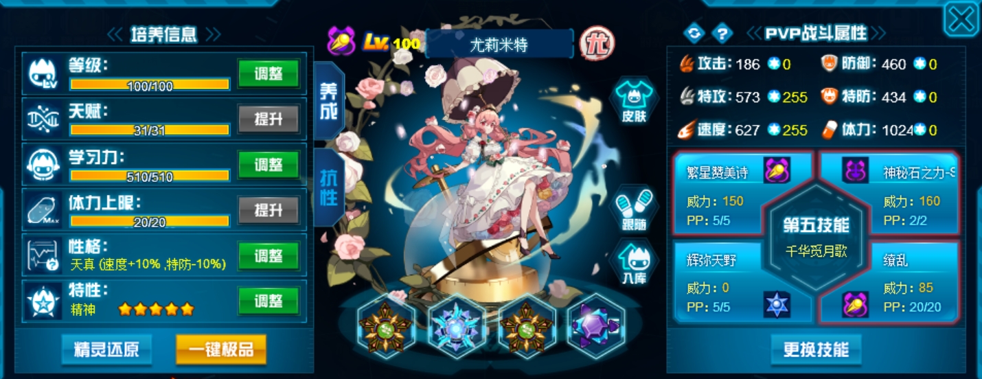 特性精神最优,其次瞬杀,尤莉米特点攻击频率很高。精神的话可以选择加速度性格把速度最大化来打辅助或者吃拦截,非精神的话就把性格改成加特攻的将输出拉满。