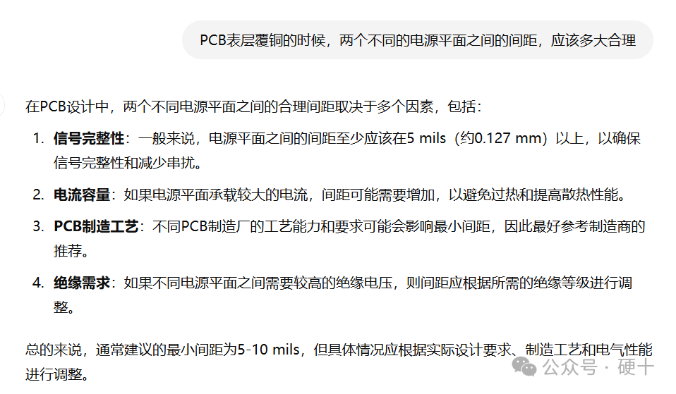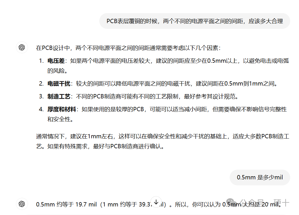 电磁干扰(EMI):不同的电源平面之间保持一定间距可以有效减少相互之间的耦合,降低电流变化引起的电磁干扰。一般推荐间距在10 mils(约0.25 mm)以上,以减少耦合效应。